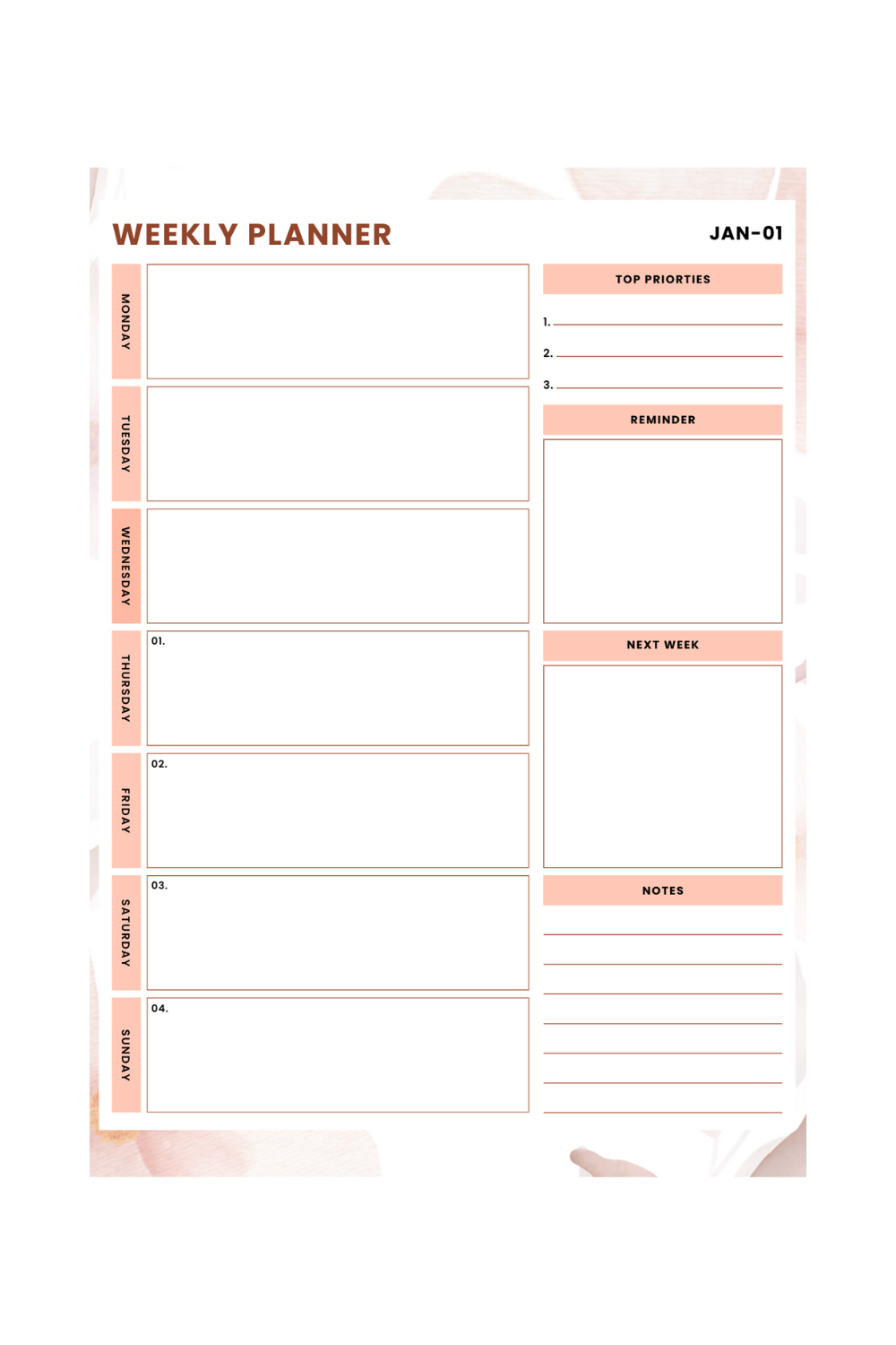 Weekly calendar pages with space for priorities and notes